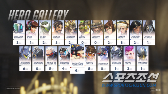 영웅 갤러리는 플레이어들이 그 동안 획득한 영웅들의 모든 스킨, 감정 표현, 승리 포즈, 캐릭터 대사, 스프레이, 그리고 하이라이트 연출 수집품들을 확인할 수 있는 곳이다. 또 플레이어가 보유하고 있는 수집품 중 장착하고 싶은 것을 선택하거나, 크레딧을 지불하여 평소에 봐두었던 스킨이나 스프레이를 잠금 해제할 수도 있다.