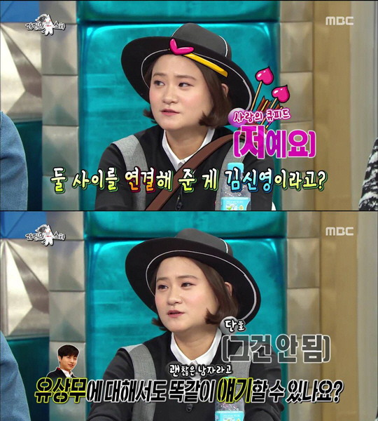 하지만 김신영은 장동민의 절친 유상무에 대해서는 단호했다. 김신영은 '유상무는 어떠냐'라는 질문에 "안된다. 소문이 안좋다. 유상무는 선후배하고만 친하다"라며 "유상무 좋아한다는 여자 있으면 뺨이라도 때리면서 정신차리라고 할 것"이라고 단언해 좌중을 웃겼다.