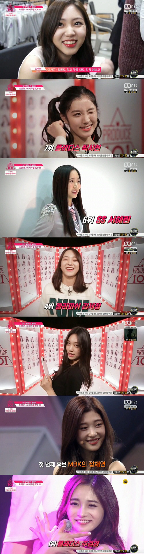 연습생들이 뽑은 순위는 11위 JYP 전소미, 10위 SS 이수현, 9위 MBK 기희현, 8위 큐브 권은빈, 7위 플레디스 박시연, 6위 SS 서혜린.