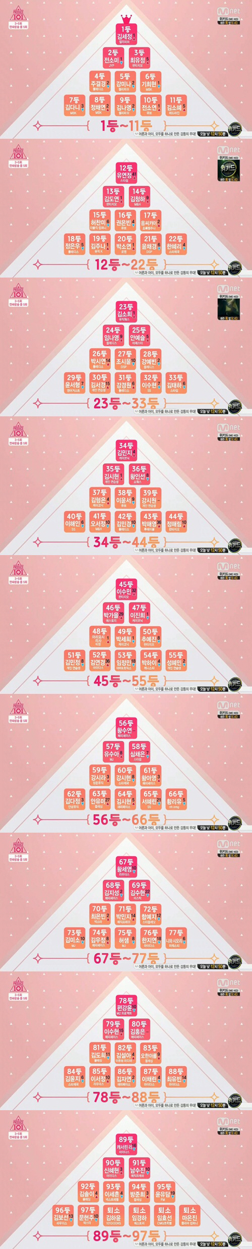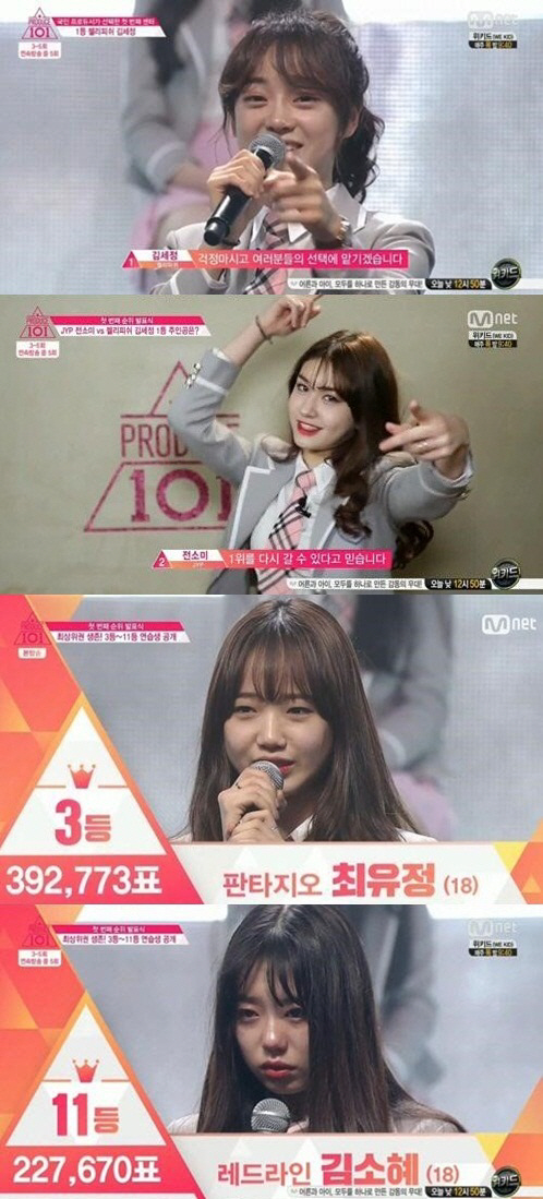 '프로듀스 101' 연습생의 순위가 공개됐다. 1위는 젤리피쉬 김세정이 차지했다.
