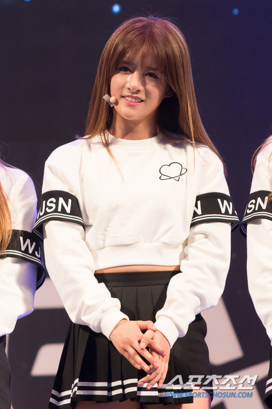 'KT 기가 레전드 매치'가 20일 오후 서울 중구 장충체육관에서 열렸다. 이날 열린 레전드 매치'에는 홍진호, 기욤, 임요환, 이윤열 등 4인의 스타크래프트 전설들이 참여해 열띤 승부를 겨루었다. 걸그룹 우주소녀가 첫 선을 보이는 무대에서 자기소개를 하고 있다.