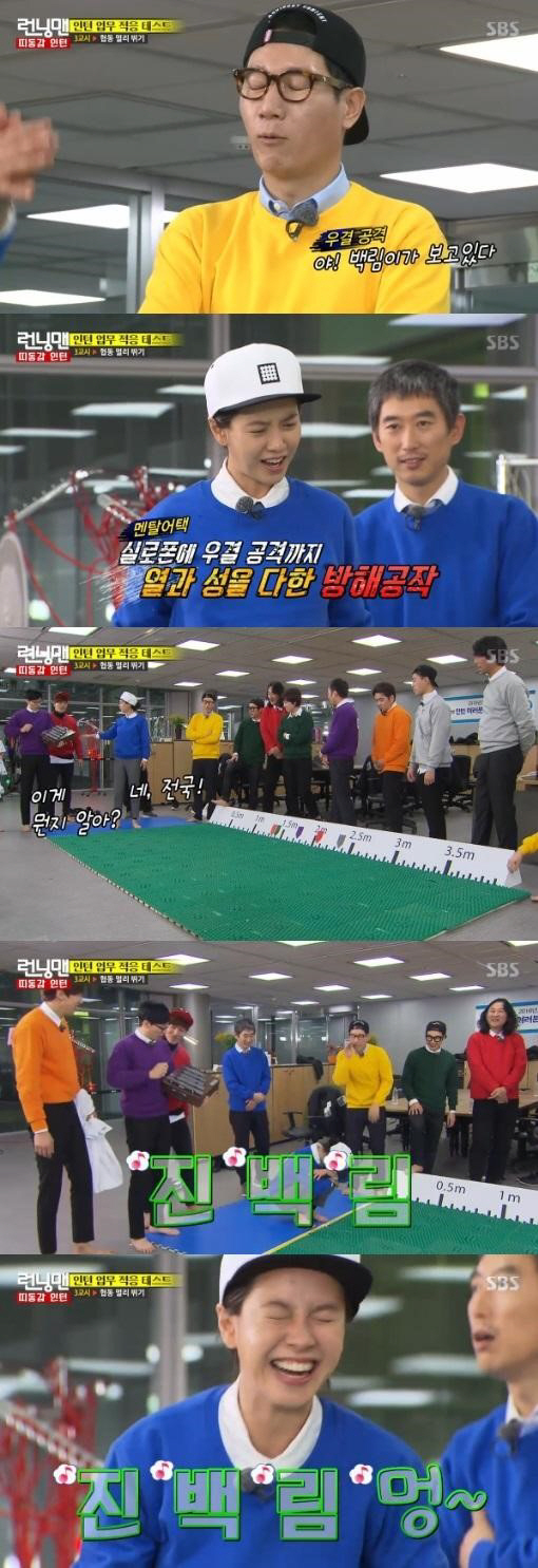 이에 송지효는 지석진을 만류했지만, 이번엔 유재석이 진백림에 대해 언급했다. 유재석은 실로폰으로 '딩동댕'을 치며 이게 뭔지 아냐고 물었다. 이에 송지효는 "안다. 전국노래자랑"이라고 했지만, 유재석은 "아니다"라며 음에 맞춰 진백림을 말해 폭소를 자아냈다.