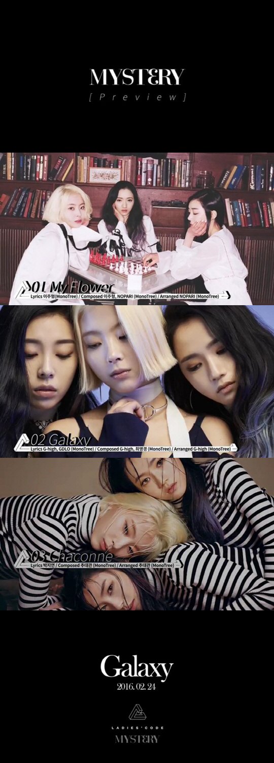 한편 앞서 레이디스 코드는 숫자 3을 모티브로 한 오브제들이 등장하는 타이틀곡 '갤럭시'의 뮤직비디오 티저 영상을 공개하며 여느 걸그룹과 노선을 달리하는 레이디스 코드만의 새 컴백 콘셉트에 대해 한껏 궁금증을 고조시켜왔다. 지난 2014년 '키스 키스(Kiss Kiss)' 이후 약 2년만에 멤버 충원 없이 3인으로 팬들 곁으로 돌아온 레이디스 코드의 새 싱글 앨범 '미스터리(MYST3RY)'는 오는 24일 0시 전 온라인 음악 사이트를 통해 발매된다.