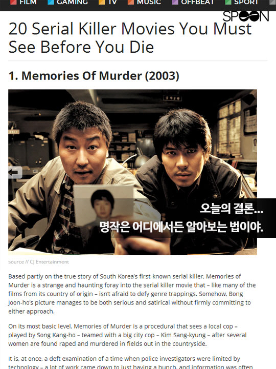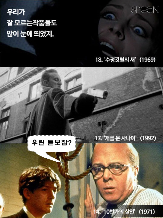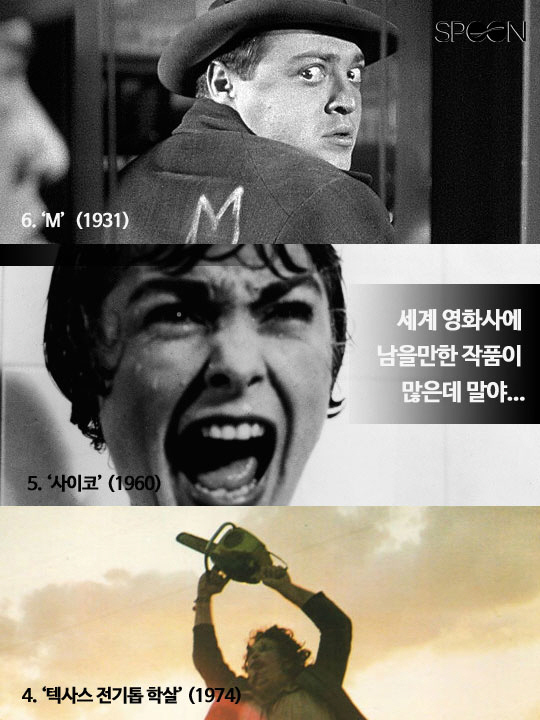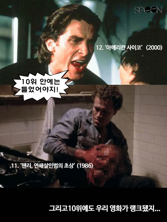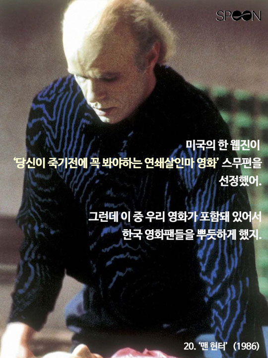 [스포츠조선 고재완 기자] 마니아 층이 있을 정도로 연쇄살인범이 등장하는 스릴러 영화는 전세계적으로 인기가 많죠. 그래서인지 미국의 한 웹진이 '죽기 전에 꼭 한 번 봐야하는 연쇄살인범 영화 20편'을 꼽았습니다. 그런데 이 중에 우리에게 친숙한 작품도 많네요. 한번 확인해 보실까요?