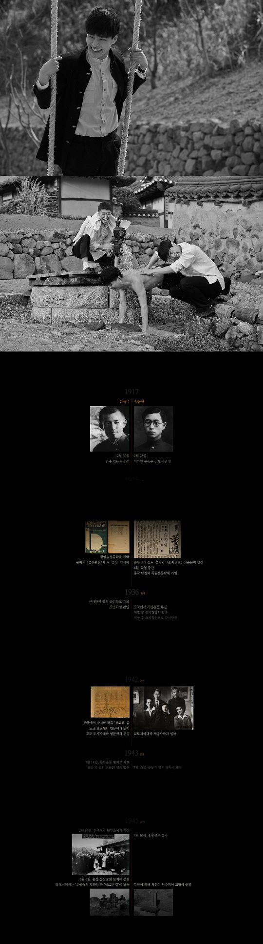 한 집에서 태어나 같은 형무소에서 옥사한 시인 윤동주와 독립운동가 송몽규는 평생을 함께한 벗이자 라이벌이었다. 영화가 끝나고 올라가는 엔딩크레딧은 두 인물의 일대기로 구성됐다. 주연배우 강하늘이 직접 부른 OST '자화상'이 흘러나오는 가운데 윤동주와 송몽규의 실제 사진이 등장하고, 이들이 북간도 용정중학교와 서울 연희전문학교에서 공부하던 시절의 짧은 일화가 소개된다. 이후 일본 유학 시절 '재교토 조선인 학생 민족주의 그룹사건'으로 체포돼 옥사한 뒤 고향 북간도에 묻히기까지 스물여덟 생애가 천천히 흘러간다. 이 엔딩크레딧에 들어간 송몽규의 묘소 사진은 송몽규를 연기한 박정민이 직접 용정을 방문했을 때 찍은 사진이라 의미가 더 크다.