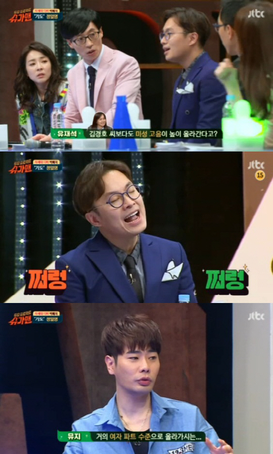 정일영의 노래를 들은 유재석은 "고음이 엄청 올라가는 거 아니냐"고 말했고, 뮤지도 "거의 여자 파트 수준으로 올라간다"라며 입을 다물지 못했다. <스포츠조선닷컴>