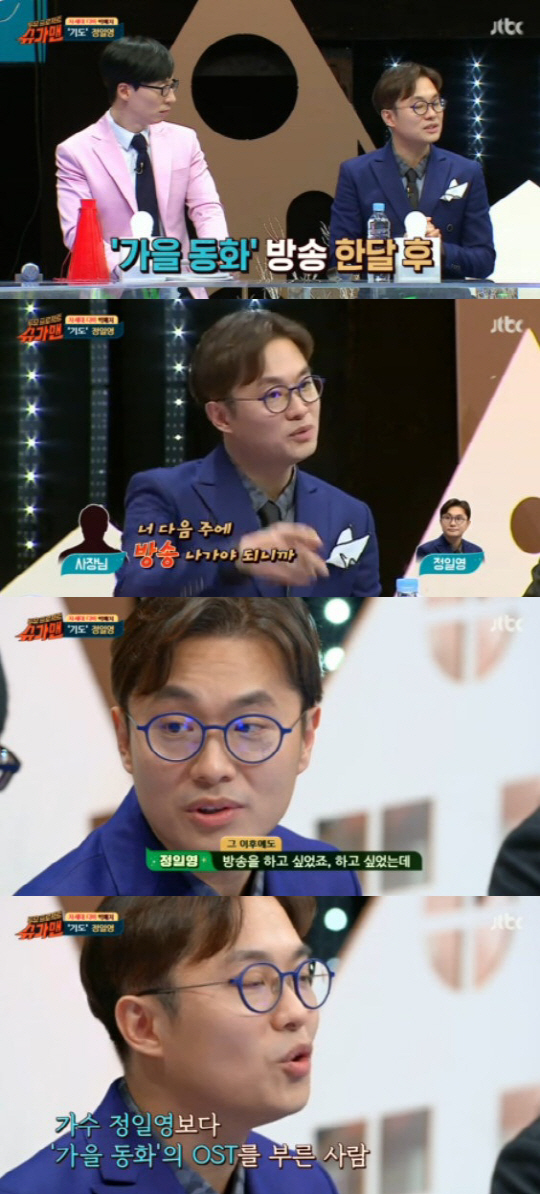 23일 오후 방송된 JTBC '투유 프로젝트 - 슈가맨'에는 드라마 '가을동화' OST '기도'의 주인공 정일영이 '슈가맨'으로 등장했다.