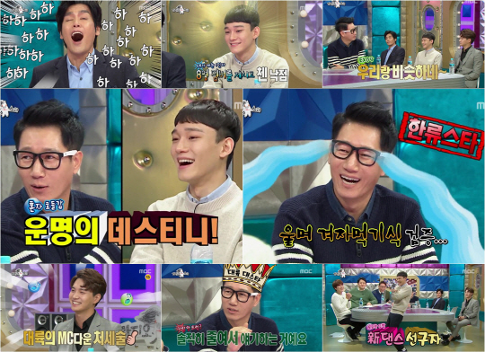 [스포츠조선닷컴 김준석 기자] '라디오스타'에 출연한 '대륙 스타일' 지석진-최성국-첸-김은성이 마음껏 매력을 뽐내며 한국 국가대표 스타임을 자체 인증했다. 무엇보다 중국 내 자신의 인지도를 설명하며 열을 올린 지석진은 범접불가 인기를 지닌 엑소(EXO) 첸의 얘기에 동질감을 느끼는 모습으로 웃음을 자아냈고, 최성국-김은성 역시 화수분 매력을 발산하며 수요일 안방극장을 제대로 사로잡았다. 시청률은 변함없는 동 시간대 1위를 기록했다.