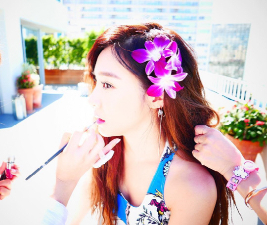 민소매 의상을 선택한 티파니는 긴 머리를 풀어헤친 채 머리에 예쁜 꽃을 착용, 청순미를 업그레이드 시켰다.