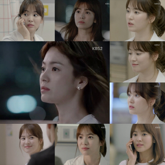 먼저 송혜교는 상황에 따라 달라지는 눈빛으로 시청자를 사로잡았다. 의사로서 환자 앞에서 강단 있는 강모연의 모습을 보여줄 때, 송혜교의 눈빛은 단호했다. 친구와 대화를 나눌 때는 눈빛 속에 친근함이 담겨 있었으며, 갑자기 나타나 마음을 흔들어 놓는 남자 유시진을 바라보는 눈빛은 청량하고 맑았다. 위급한 환자를 살리기 위해 노력할 때, 그녀의 눈빛은 치열함으로 가득했다.