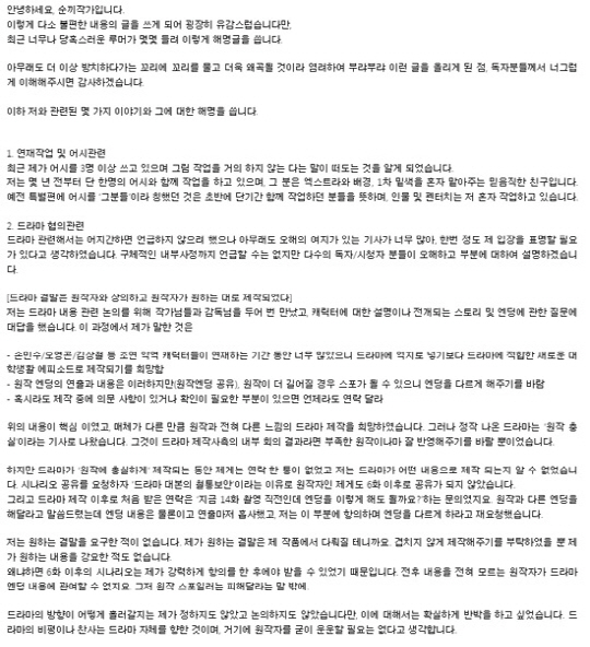 드라마 관련해서는 어지간하면 언급하지 않으려 했으나 아무래도 오해의 여지가 있는 기사가 너무 많아, 한번 정도 제 입장을 표명할 필요가 있다고 생각하였습니다. 구체적인 내부사정까지 언급할 수는 없지만 다수의 독자/시청자 분들이 오해하고 부분에 대하여 설명하겠습니다.