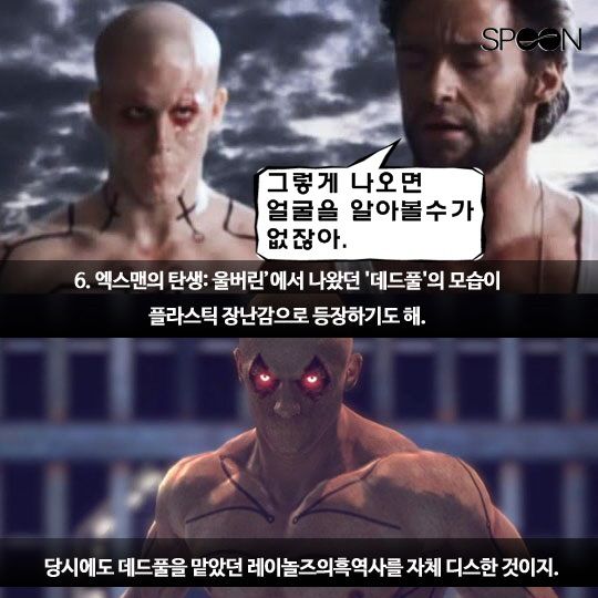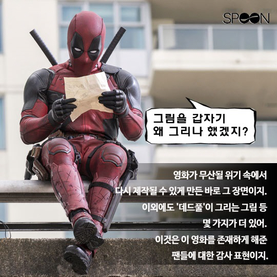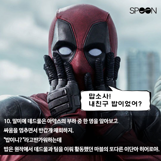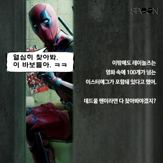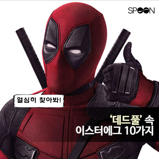 [스포츠조선 고재완 기자] 마블 히어로 '데드풀'이 우리나라에서도 박스오피스 1위를 이어가면서 흥행에 성공하고 있죠. 이미 우리나라에서 200만 넘는 관객을 모은 '데드풀'은 전 세계 시장에서 맹위를 떨치고 있습니다. 그런 '데드풀' 속에는 찾아보면 더 재미있는 숨겨진 이스터 에그가 있다고 하는데요. 그 10가지를 공개합니다.