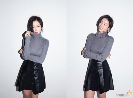 또 블랙&그레이를 매치, 얇은 골지의 폴라로 바디라인을 강조해 시크하면서도 노출 없이도 섹시한 분위기를 자아냈고 라운드 가죽치마로 여성스러움도 놓치지 않았다.