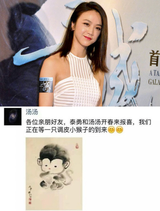 탕웨이는 26일 자신의 SNS에게 "태용과 내게 좋은 소식이 있다. 우리는 개구쟁이 원숭이(아기)를 기다리고 있다"라는 글을 올렸다.