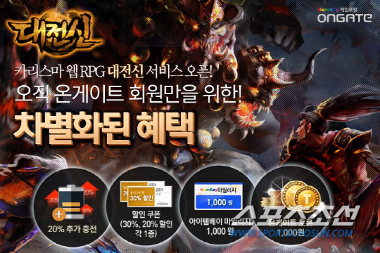 아이템베이가 운영하고 있는 게임 포털 사이트 온게이트는 이번 '대전신' 채널링을 기념해 다양한 이벤트를 준비했다. 우선 아이템베이 마일리지를 온게이트 전용 토큰으로 충전 시, 20%를 추가 지급하며 이용 약관에 동의한 회원들에게는 아이템베이 마일리지 1000원권, 토큰충전 할인권 2종을 지급한다. 또 결제 금액과 무관하게 첫 결제를 한 대상에게는 1000원 상당의 대전신 전용 토큰을 지급한다.