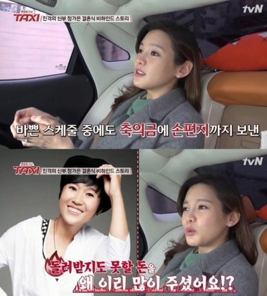 이날 방송에서 정가은은 "송은이는 결혼식장에 오지도 못했는데 매니저를 통해 손편지와 함께 축의금 100만원을 보냈다"라고 설명했다.