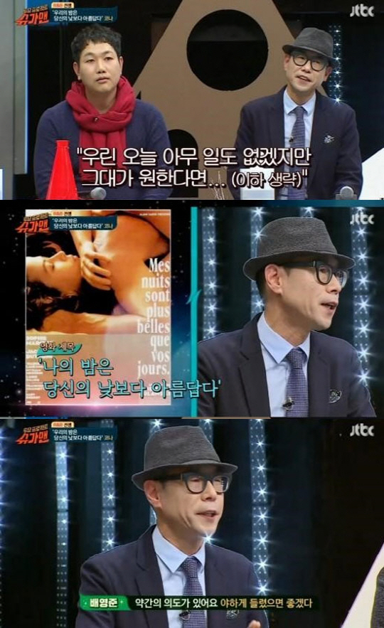 1일 방송된 JTBC '투유 프로젝트 슈가맨'에서는 배영준, 정태석의 그룹 '코나'가 '슈가맨'으로 소환돼 '당신의 밤은 우리의 낮보다 아름답다'를 부르며 등장했다.