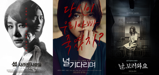 개봉할 스릴러물들도 많다. 오는 3일 개봉을 앞둔 '섬. 사라진 사람들'이 사건 목격 스릴러라는 독특한 장르로 선보이고 이어 추적 스릴러 '널 기다리며'가 10일, 충격실화 스릴러 '날,보러와요'가 4월 개봉한다. '섬. 사라진 사람들'은 염전노예사건 관련자가 전원 사망했다는 충격적인 사건을 둘러싼 '사건 목격 스릴러'다.
