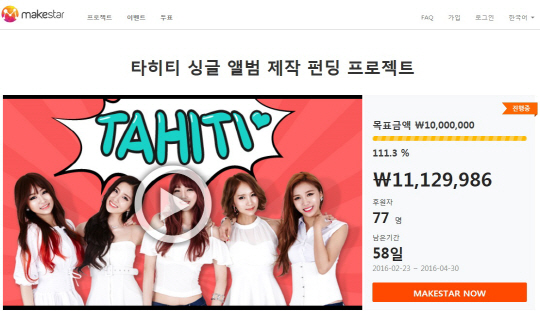 [스포츠조선 김표향 기자] 걸그룹 타히티가 크라우드 펀딩으로 제작에 나선 싱글 앨범 프로젝트가 주목받고 있다.