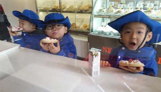 삼둥이 하면 빼놓을 수 있는 먹방. 만세는 베이글을 야무지게 한 입 베어물고 있으며, 대한이와 민국이는 자신들을 촬영 중인 아빠를 향하고 있어 시선을 집중시켰다.