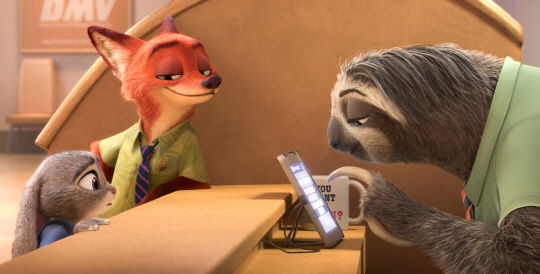 | ZOOTOPIA 슌FLASH, THE FASTEST SLOTH AT THE DMV -- When rookie rabbit officer Judy Hopps (voice of Ginnifer Goodwin) has only 48 hours to crack her first case, she turns to scam-artist fox Nick Wilde for help, but he doesn't always have her best interests at heart. Their investigation takes them to the local DMV (Department of Mammal Vehicles), which is staffed entirely by sloths. Directed by Byron Howard and Rich Moore, and produced by Clark Spencer, Walt Disney Animation Studios' "Zootopia" opens in U.S. theaters on March 4, 2016. ⓒ2015 Disney. All Rights Reserved. |