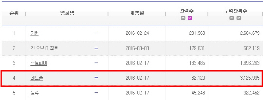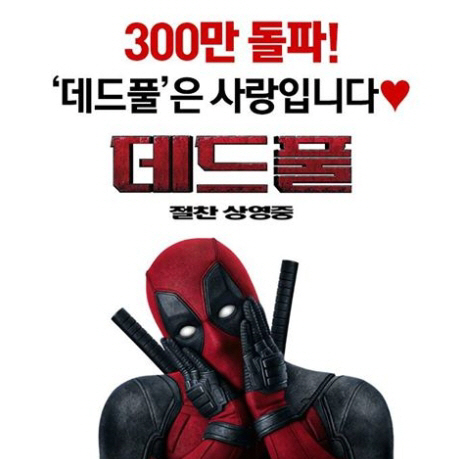 [스포츠조선 고재완 기자] 영화 '데드풀'이 누적 관객 312만 5000명으로 300만 명 관객을 돌파하며 역대 청불 외화 흥행순위 2위에 올랐다.