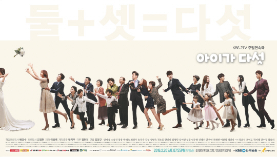 KBS 2TV 새 주말드라마 '아이가 다섯'은 싱글맘과 싱글대디가 인생의 두 번째 사랑을 만나게 되면서 가족들과의 갈등과 화해, 사랑을 통해 진정한 행복을 찾아가는 좌충우돌 감성코믹 가족극으로 미니시리즈를 능가하는 흡입력과 몰입감으로 시청자들에게 신선함을 안겨주고 있다.