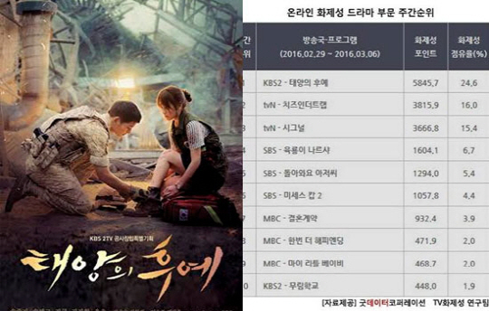 [스포츠조선닷컴 이지현 기자] KBS2 수목드라마 '태양의 후예'가 TV화제성 부문에서 2주 연속 1위에 올랐다.
