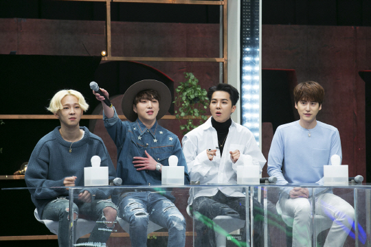 [스포츠조선닷컴 김준석 기자] SM엔터테인먼트 소속 슈퍼주니어의 멤버 규현과 YG엔터테인먼트 소속 위너의 멤버 강승윤,송민호, 남태현이 국내 최대 기획사의 자존심을 건 대결을 펼친다.