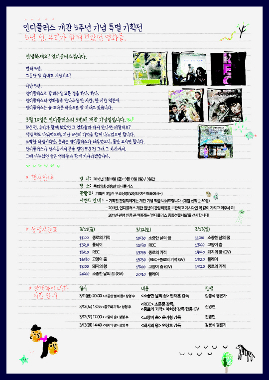 지난 5년간 독립영화전용관 인디플러스와 함께 한 관객들에 대한 감사의 마음을 담아 준비한 이번 기획전은 모든 상영작을 무료로 관람할 수 있다. 그 밖에도 '5주년 기념 떡' 증정, 인디플러스가 개관한 2011년의 관람티켓을 소지한 관객에게 독립영화 관련 기념품들을 모은 '인디플러스 종합선물세트' 증정 이벤트 등 관객들을 위한 다채로운 행사도 준비돼 있다.