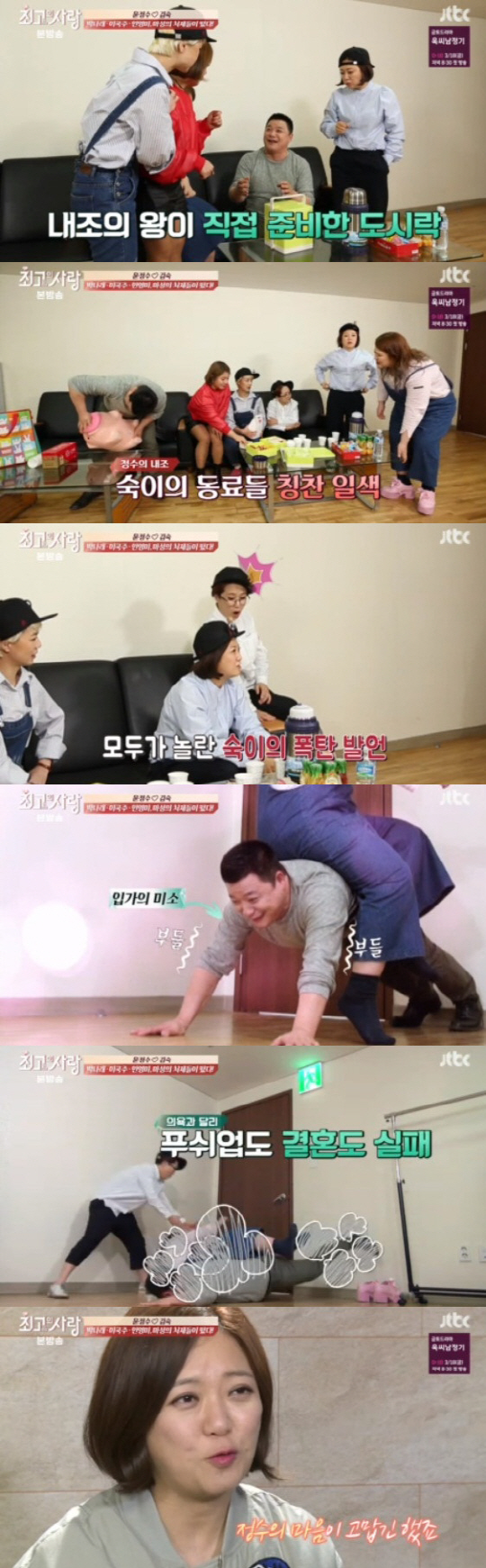 그러나 힘이 빠진 상황에서 윤정수는 마지막으로 이국주를 업게 됐고, 김숙은 "세 번 하면 진짜 결혼하자"며 깜짝 프러포즈를 했다.