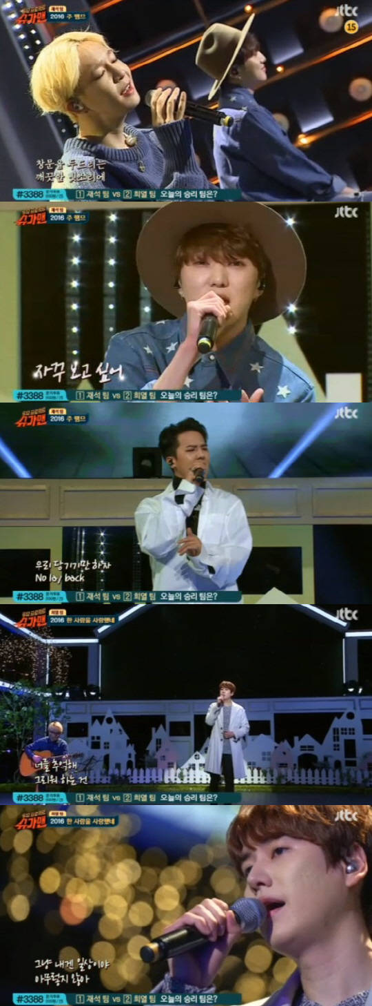 먼저 재석 팀의 위너가 '2016 주 뗌므'를 선보였다. 샹송풍의 밝고 깔끔한 음색이 돋보였던 원곡을 R&B 기반의 하우스가 가미된 팝 음악으로 재해석했다. 위너의 트렌디한 감성이 고스란히 묻어났다.