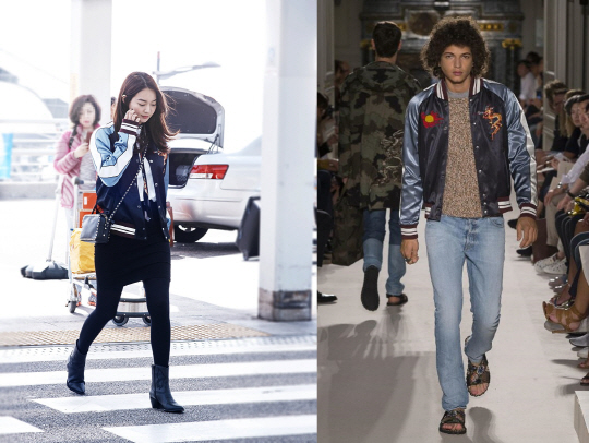 신민아와 남자모델이 착용한 의상은 동양적인 무드가 가미된 매력적인 점퍼. 신민아는 블랙 컬러의 스커트와 스터드 장식이 들어간 크로스백을 매치해 산뜻하고 귀여운 느낌으로 연출한 반면 모델은 같은 블루 컬러 계열의 데님 진을 매치해 캐주얼한 매력을 살렸다. 특히나 두드러지게 차이나는 것은 신발, 신민아는 레더 소재의 부츠로 스타일리시함을 살렸고 모델은 샌들을 매치해 점퍼의 빈티지한 무드가 더욱 강조되게 했다.