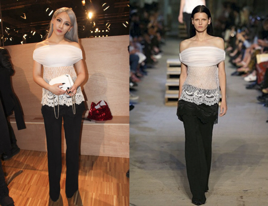 씨엘과 모델은 지방시의 독특한 블랙&화이트 시스루 의상을 선택했다. 씨엘과 모델은 비교적 비슷한 스타일링을 선보였다. 차분하게 귀 뒤로 넘긴 헤어스타일과 볼드한 액세서리 없이 매끈한 어깨라인에 집중되도록 만든 점이 돋보인다. 그러나 핏의 차이일까, 키가 크고 어깨가 더욱 각진 모델에게는 고풍스러우면서도 고딕 감성이 느껴지는 시크함이 풍기는 반면 작고 아담한 체구의 씨엘은 여성스러운 분위기가 연출되었다.