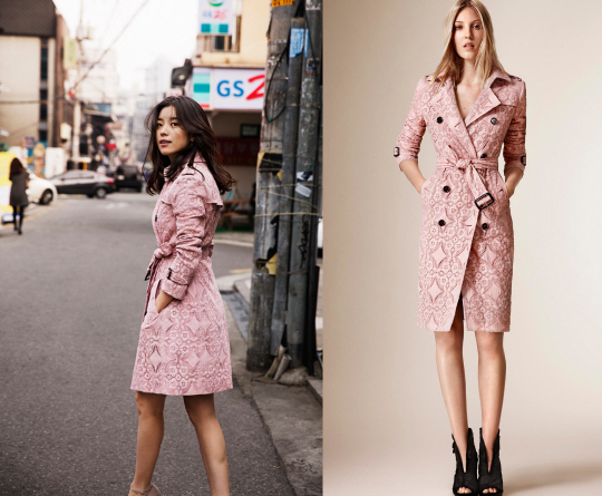 한효주와 모델이 입은 의상은 레이스 소재와 로즈쿼츠 컬러가 매력적인 트렌치코트. 모델과 한효주 모두 허리끈을 묶어 여성스러운 바디 실루엣을 제대로 드러냈다. 한효주는 베이지 컬러의 발등을 드러낸 구두를 선택해 각선미를 돋보이게 했다. 웨이브가 들어간 헤어스타일로 로맨틱한 무드를 더한다. 반면 모델은 직선으로 뻗은 헤어스타일과 블랙 컬러의 구두로 시크함을 강조했다.