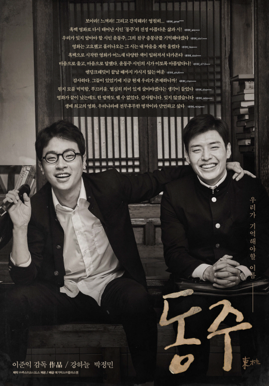 [스포츠조선 김표향 기자] 영화 '동주'가 시인 윤동주의 사촌이자 평생의 벗이었던 독립운동가 송몽규의 서거 71주기를 맞아 특별 GV(관객과의 대화)를 개최한다.