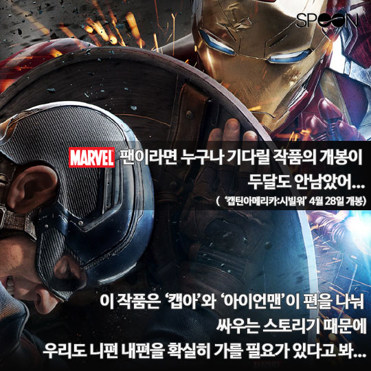 [스포츠조선 고재완 기자] '캡틴아메리카'의 세번째 시리즈 '캡틴아메리카:시빌 워'(이하 '시빌워')가 다음 달 28일 개봉합니다. 이번 작품은 '캡틴아메리카' 단독 영화임에도 불구하고 '어벤져스' 멤버들이 총 출동하는 것으로 알려져 큰 관심을 모으고 있는데요. 게다가 '어벤져스' 멤버들끼리 나뉘어 싸우는 이야기가 마블 팬들을 더욱 솔깃하게 하고 있습니다. 그렇다면 이번 '시빌워'에서 누가 아이언맨과 캡틴아메리카의 편이 됐는지 알아볼까요?