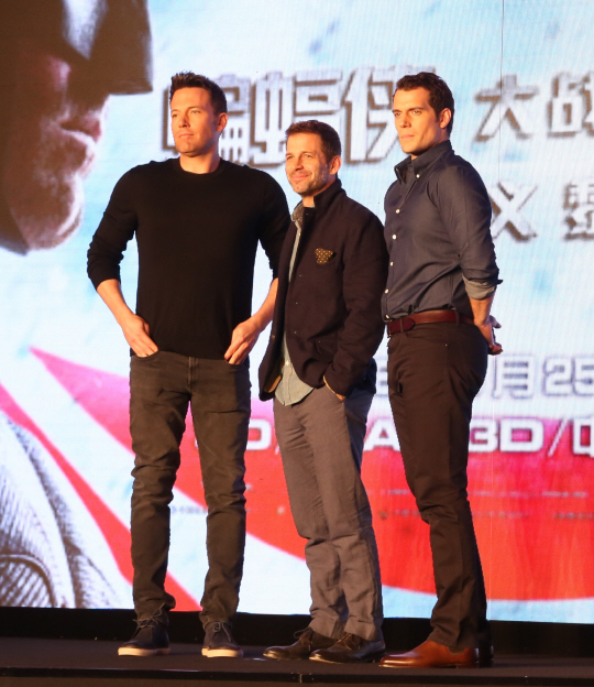 할리우드 배우 벤 애플렉과 헨리 카빌, 그리고 잭 스나이더 감독이 11일 중국 베이징 파크하얏트 호텔에서 진행된 영화 '배트맨 대 슈퍼맨: 저스티스의 시작'(이하 저스티스) 한국 기자회견에서 이같이 입을 모았다.