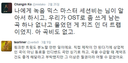 이후 이 글을 '치인트' OST를 담당한 음악감독 티어라이너가 리트윗하며 "링크한 트윗도 분노할 만한 일이다. 직접 제작이 안 된다기에 상업적인 곡이 아닌 동료들 인디밴드 곡만 싣기로 하고, 곡을 수급할 때 계약조건도 좋게 해달라고 부탁했지만 그 이상은 월권이라 어쩔 수 없었다"고 멘션을 넣어 네티즌들 사이에서는 CJ E&M측이 OST 제작 과정에서 인디밴드에 갑질을 한 것이 아니냐는 의혹이 일었다.