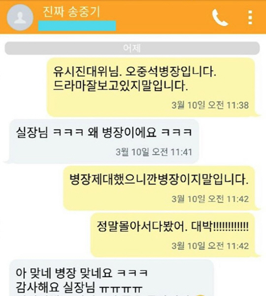 오중석은 11일 자신의 인스타그램을 통해 "드라마 몰아보고나서 급 팬심 발동"라는 글과 함께 송중기와 나눈 문자 캡처 사진을 공개했다.