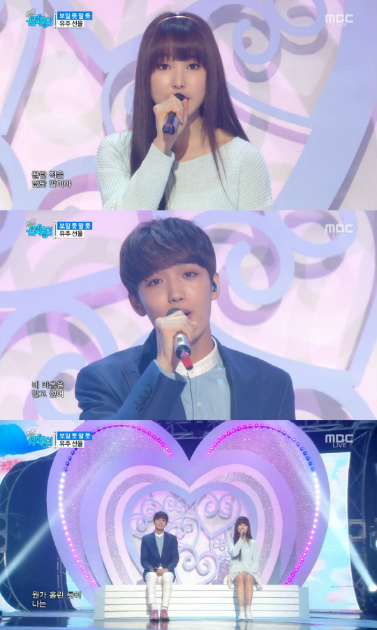 10인조 보이그룹 업텐션(UP10TION 진후, 쿤, 고결, 웨이, 비토, 우신, 선율, 규진, 환희, 샤오)의 선율과 대세 신인 걸그룹 여자친구(소원, 예린, 은하, 유주, 신비, 엄지)의 유주가 신곡 '보일 듯 말 듯'으로 '음악중심' 첫 무대를 가졌다.