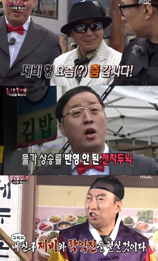 이후 멤버들은 시장으로 이동해 봄나물 체포작전을 시작했고, 이때 정총무로 변신한 정준하가 나물 값을 계산하는 모습으로 또 한 번 시청자들을 웃겼다.