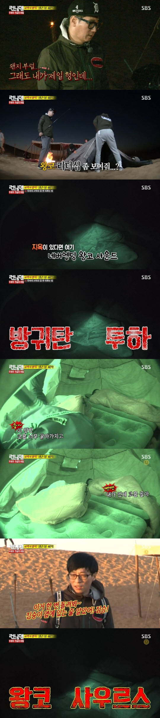 ' 멤버들. 스카이다이빙 미션을 성공하지 못한 유재석, 지석진, 이광수, 하하는 사막에서 비박을 하게 됐다. 특히 지석진 특유의