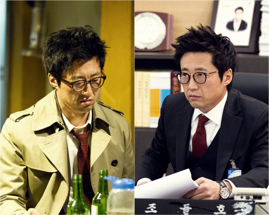 검은 수트를 차려입은 검사 시절의 조들호는 강직한 표정과 형형한 눈빛만으로도 그의 잠재된 야망을 확인할 수 있는 반면 변호사 시절엔 카리스마는 찾아볼 수 없는 소탈한 모습이 시선을 강탈하고 있다.