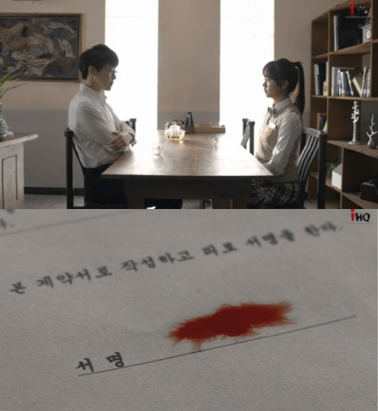 김슬기가 "할게요, 계약"이라고 말하자 그 순간, 김슬기의 손가락에서 벤 피 한 방울이 뚝 떨어져 서명란에 '김슬기' 세 글자를 새기며 계약이 성사되며 섬뜩함을 자아냈다.