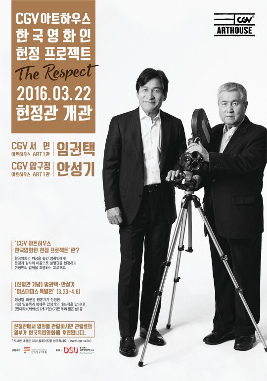 [스포츠조선 김표향 기자] 독립·예술영화 전용관 CGV아트하우스가 '한국영화인 헌정 프로젝트'의 일환으로 임권택 감독과 배우 안성기의 이름을 딴 헌정관을 개관한다고 16일 밝혔다.