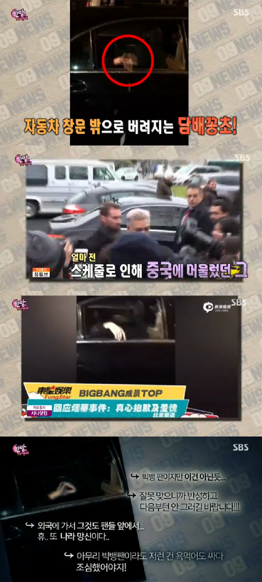[스포츠조선닷컴 김영록 기자] '한밤의TV연예'가 빅뱅 탑의 '담배꽁초 무단투기' 논란을 조명했다.