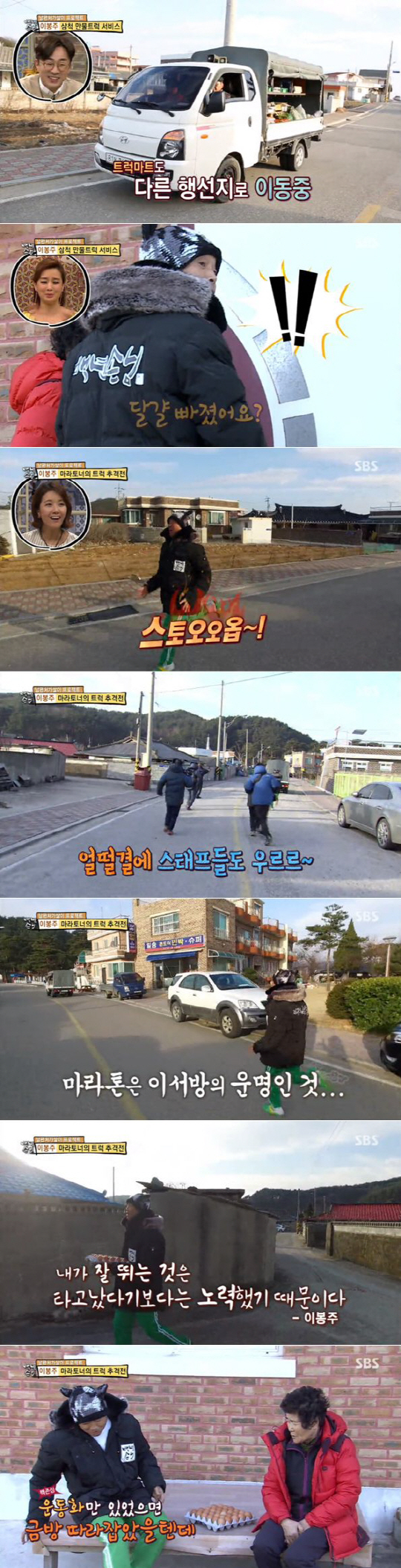 이봉주는 "저기요~ 스톱"을 외치며 트럭을 쫓아가기 시작했다. 스태프들도 황급히 뒤쫓았으나 이봉주의 체력을 따라가기엔 무리였다. 잠시 후 의기양양하게 돌아오는 이봉주의 손에는 달걀 한 판이 들려있었다.
