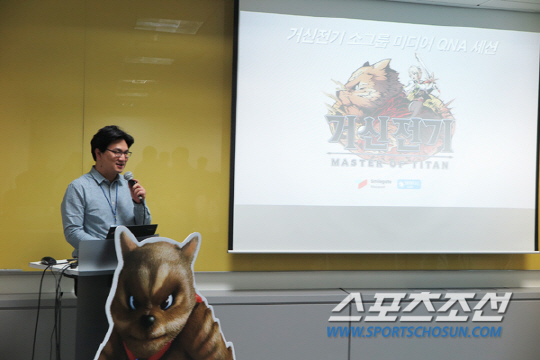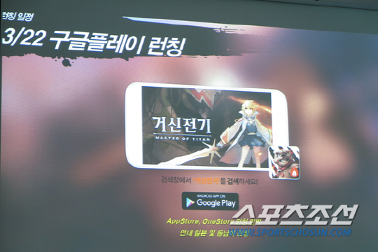 주민석 스노우폴 대표는 '게임의 차별성' 설명을 시작으로 '출시 날짜'와 세부적인 사항을 설명했다. '거신전기'는 애니메이션 스타일의 그래픽을 기반으로 호쾌한 전투 시스템을 담은 게임으로 소개됐으며 거신을 이용한 탑승 전투 시스템을 구성해 기존 모바일게임과의 차별성을 시도했다고 밝혔다.
