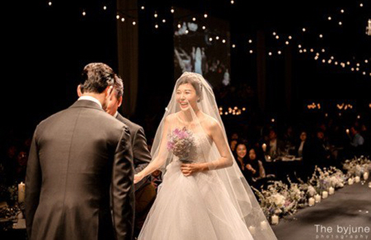 공개된 사진에서 김하늘은 아버지의 손을 잡고 축하를 받으며 행진, 신랑의 손에 인계됐다. 김하늘은 시종일관 밝게 웃는 얼굴로 행복감을 뽐내고 있다.